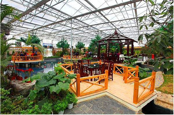 綠色生態(tài)餐廳完全按照標(biāo)準(zhǔn)溫室的結(jié)構(gòu)建造,多采用文洛式,覆蓋材料多為PC板或者玻璃,結(jié)構(gòu)保溫性能好,整齊規(guī)范,室內(nèi)各個(gè)空間溫度均勻,有利于景觀植物的生長(zhǎng),鑒于餐飲布局的需要,在文洛溫室結(jié)構(gòu)的基礎(chǔ)上,可進(jìn)行局部調(diào)整。該溫室建造成本相對(duì)較低,溫室升降溫能耗低,節(jié)約后期運(yùn)行費(fèi)用。