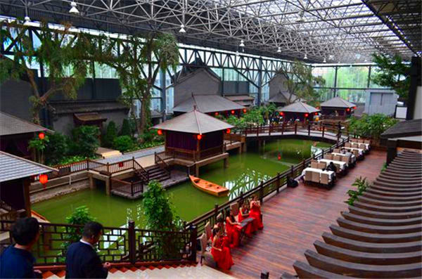 綠色生態餐廳完全按照標準溫室的結構建造,多采用文洛式,覆蓋材料多為PC板或者玻璃,結構保溫性能好,整齊規范,室內各個空間溫度均勻,有利于景觀植物的生長,鑒于餐飲布局的需要,在文洛溫室結構的基礎上,可進行局部調整。該溫室建造成本相對較低,溫室升降溫能耗低,節約后期運行費用。